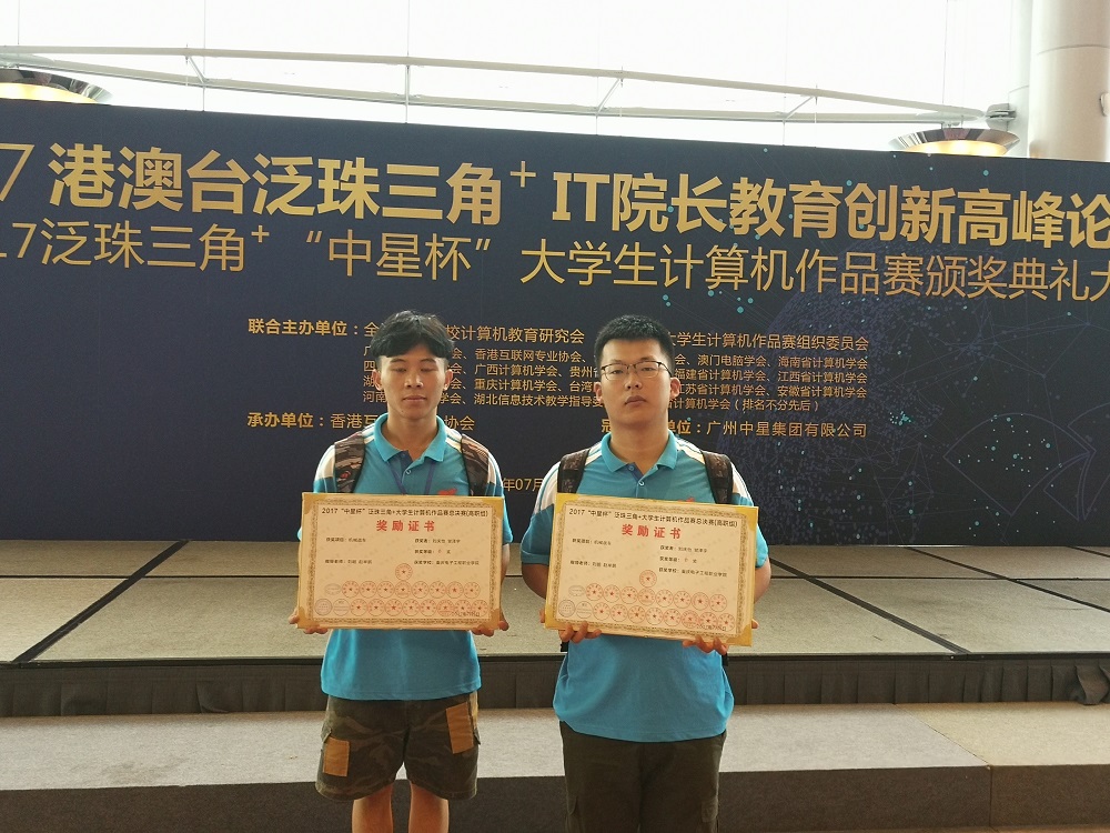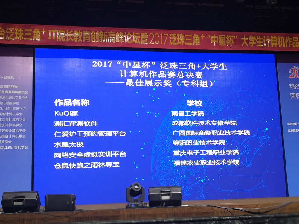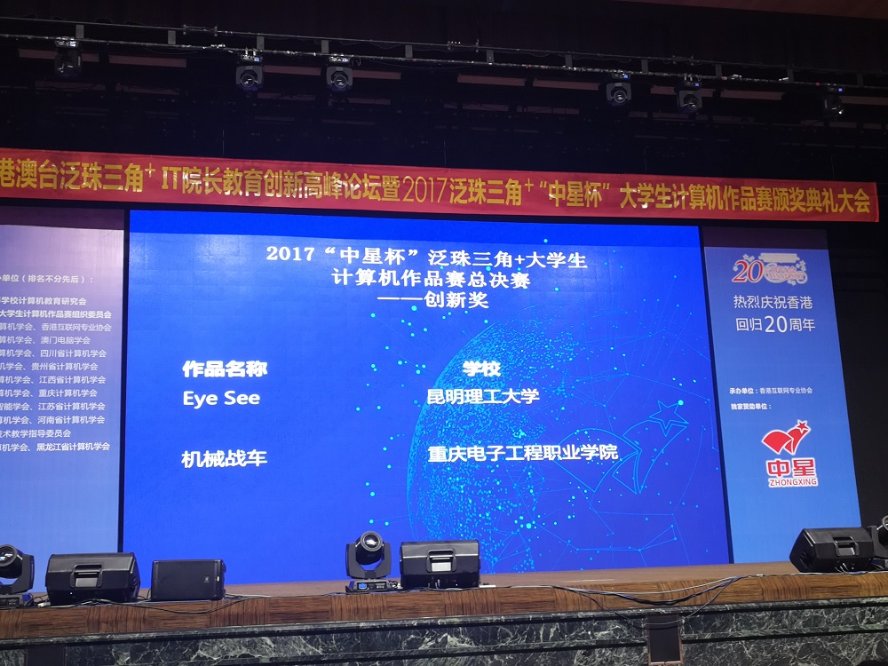 2017年7月5日,2017泛珠三角+“中星杯”大学生计算机作品赛颁奖典礼在香港会展中心举行。重庆电子工程职业学院计算机学院共2项作品入围奖项,其中,由刘明和赵鹏举教师指导的“机械战车”作品获得总决赛高职组金奖(一等奖的第二名)和最佳创新奖(高职组唯一入选作品),由鲁先志老师指导的李子熊、刘俊江两名学生作品“网络安全虚拟实训平台”获得铜奖和最佳展示奖,这是我校首次参加该赛事获此殊荣。