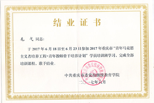 经校党委学工部推荐,校党委同意,物联网学院毛弋同志被选派参加6月18日至6月23日在中共重庆市委党校举行的2017年重庆市“青年马克思主义者培养工程·青年教师骨干”培训班学习。