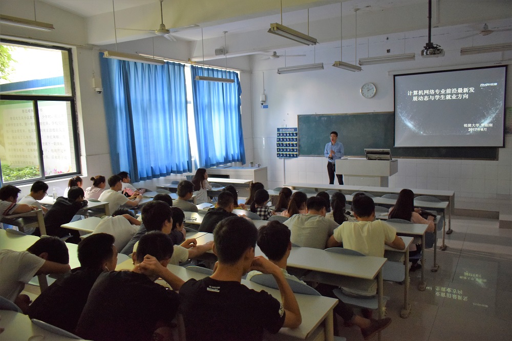 在学校创新创业活动周中,计算机学院诚邀重庆锐捷网络股份有限公司罗脂刚总经理来我校做了一场名为“计算机网络专业前沿最新发展动态与学生就业方向报告”的主题讲座。学院网络专业的学生参会,网络教研室主任唐继勇老师,网络专业辅导员孙家泽老师作为嘉宾莅临现场。