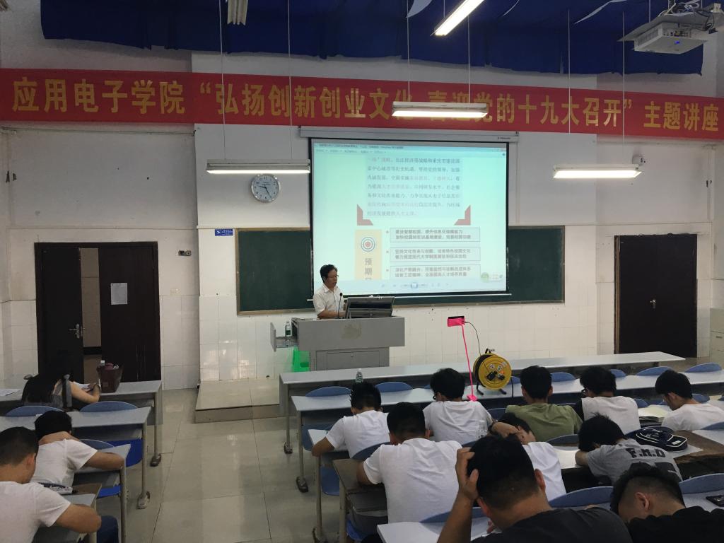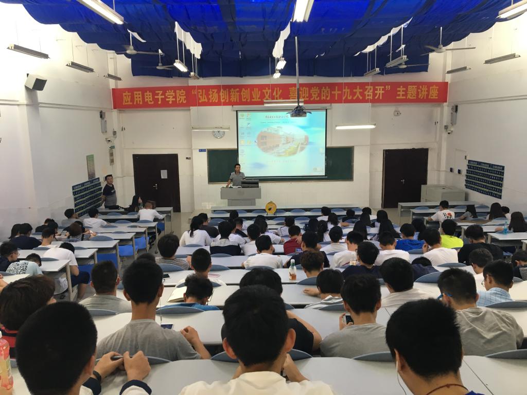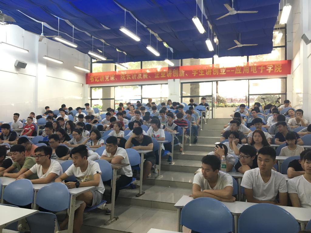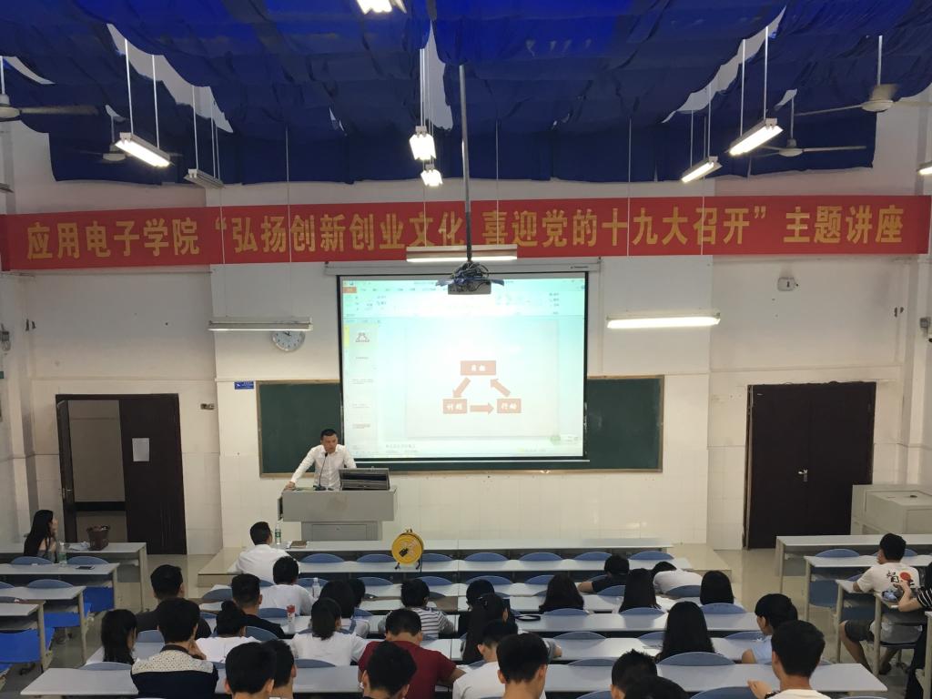 6月7日上午,应用电子学院“弘扬创新创业文化 喜迎党的十九大召开”主题讲座在南校区7-209教室举行。本次主题讲座由书记讲党课、院长讲发展、企业讲创新、学生讲创业四个部分组成。应用电子学院2015级、2016级学生代表参与本次主题讲座。