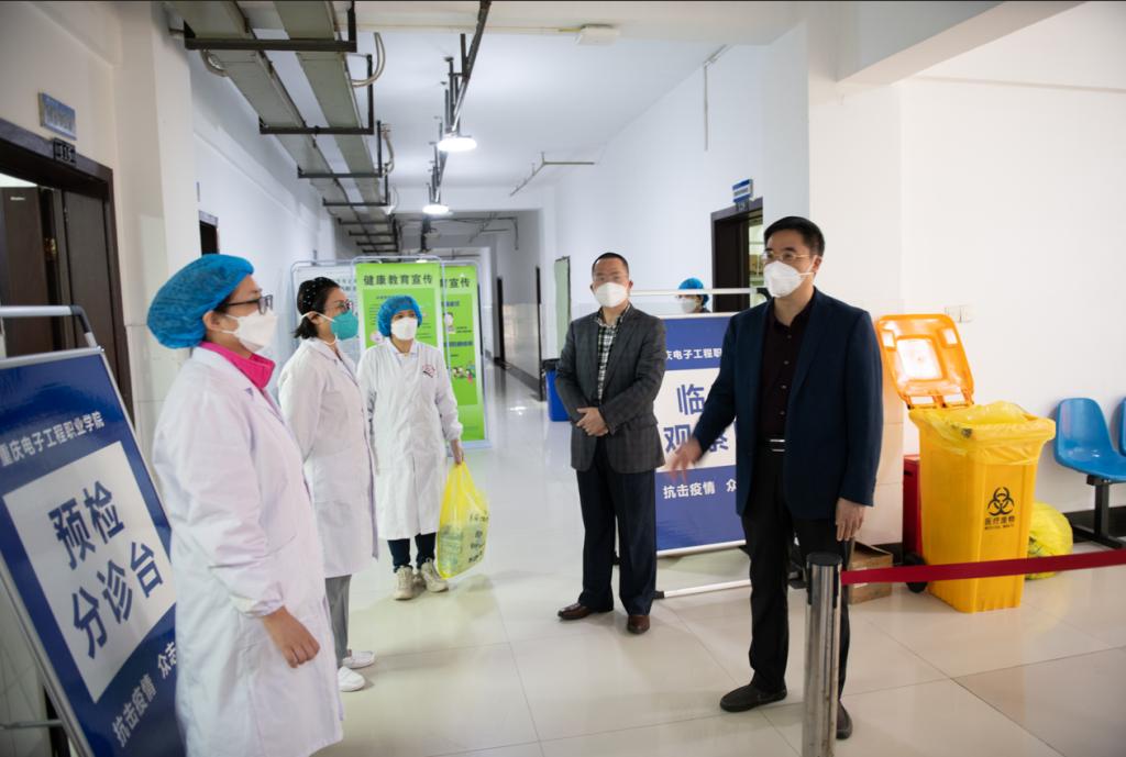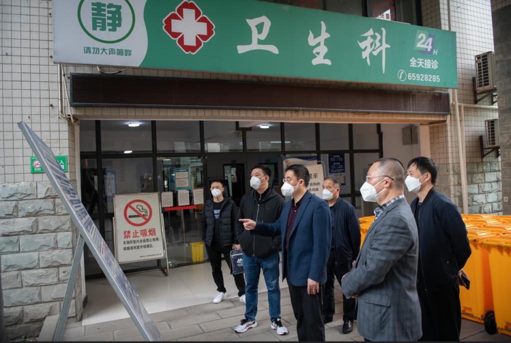 “防护物资缺不缺?人员队伍齐不齐?要保障好师生们的医疗物资需要。”刘宴兵、何建军一行指导学校医务工作。