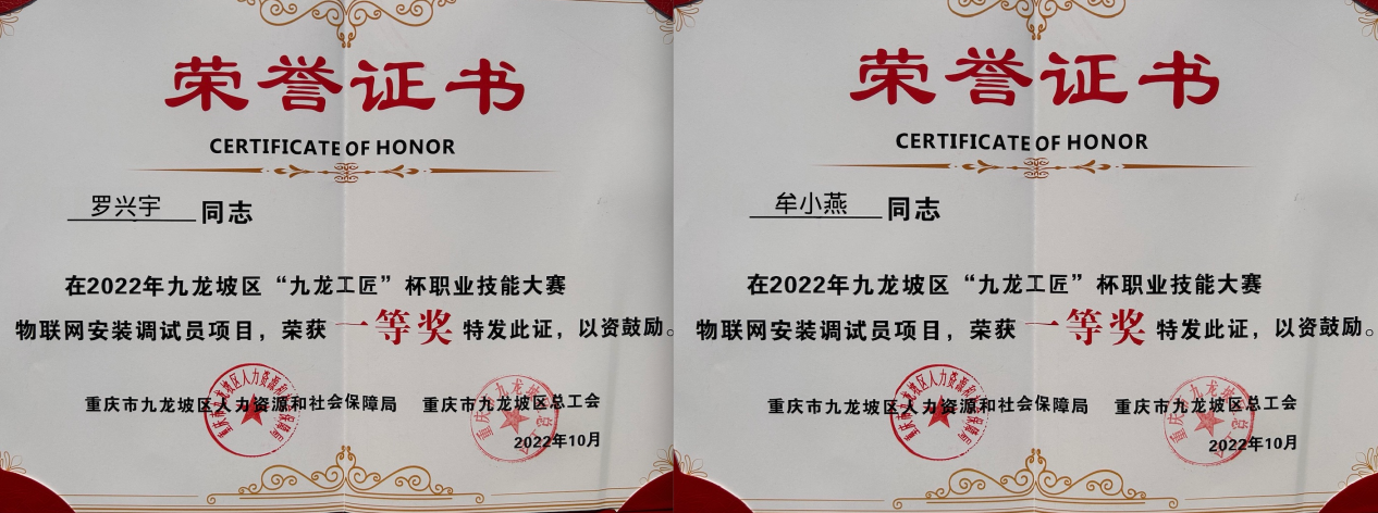 金秋十月,丹桂飘香。通信工程学院老师在2022年九龙坡区“九龙工匠”杯职业技能大赛物联网安装调试员项目中取得优异成绩,其中罗兴宇、牟小燕两位老师斩获教师技能比赛一等奖,冉锋力教师荣获三等奖。