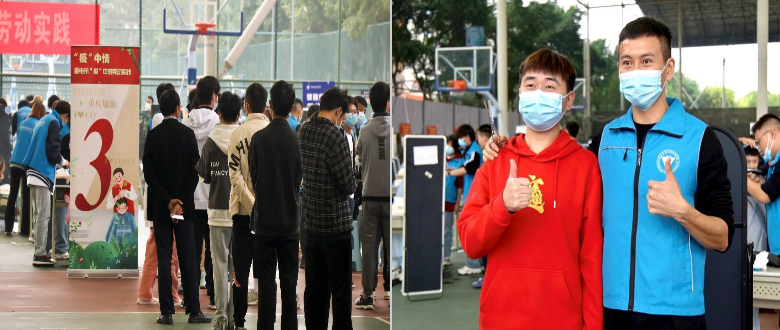 11月23日中午,重庆电子工程职业学院风雨球场上一片繁忙的景象,127名志愿者身披马甲、戴着口罩,正熟练地为师生理发。