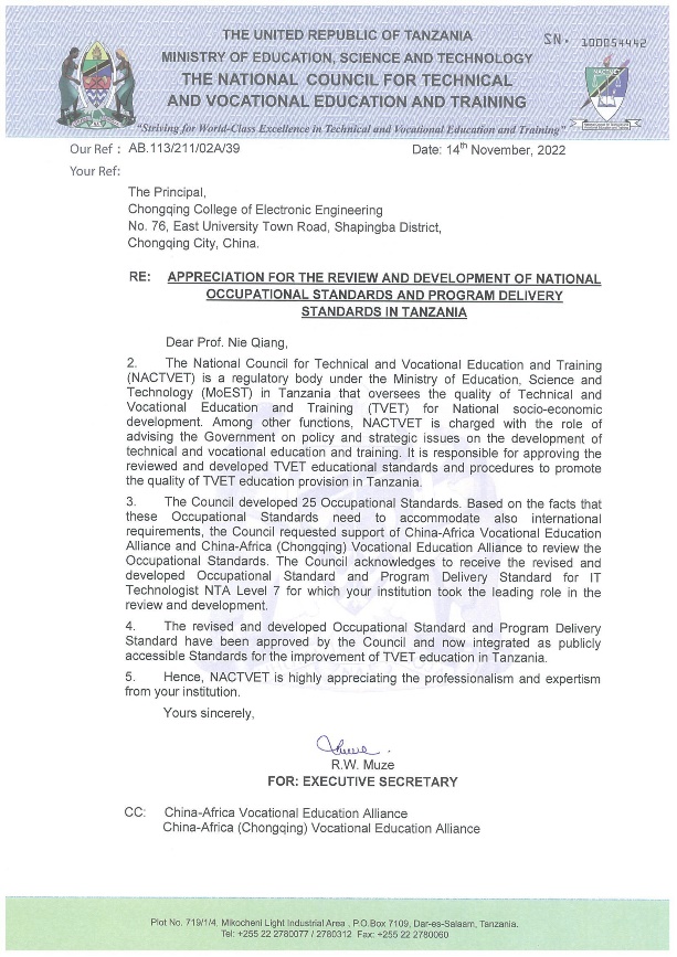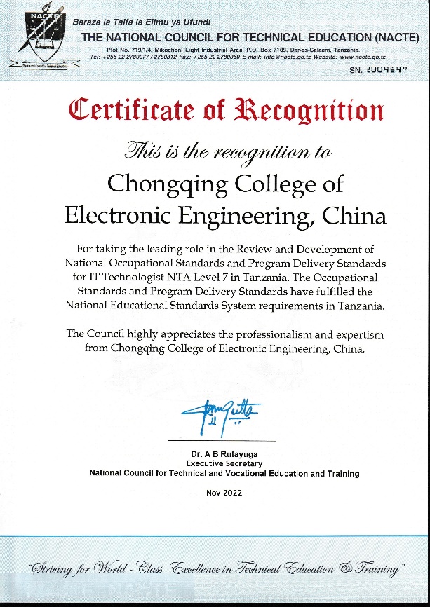近日,由我校国际合作发展处支持、通信工程学院牵头研制的信息技术工程师7级、8级职业岗位标准以及配套专业教学标准(以下简称标准)通过了坦桑尼亚国家职业教育委员会审核,获得官方认证,并被纳入了坦桑尼亚国家职业教育体系,弥补了坦桑尼亚在信息技术工程师方向的标准缺失,对非洲国家的星空(中国)和产业发展具备重要意义,是我校国际化标准真正“走出去”的重大突破。