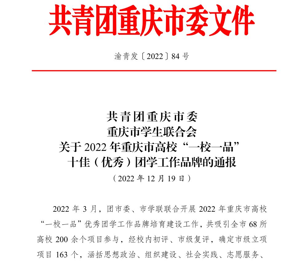 2022年3月,团市委、市学联联合开展2022年重庆市高校“一校一品”优秀团学工作品牌培育建设工作,共吸引全市68所高校200余个项目参与,经校内初评、市级复评,确定市级立项项目163个,涵盖思想政治、组织建设、社会实践、志愿服务、心理健康、创新创业、就业见习、文化艺术、体育竞技、权益维护、其他类别等,通过评估工作组开展线上交叉评估,择优遴选127个项目进入交流展示环节。