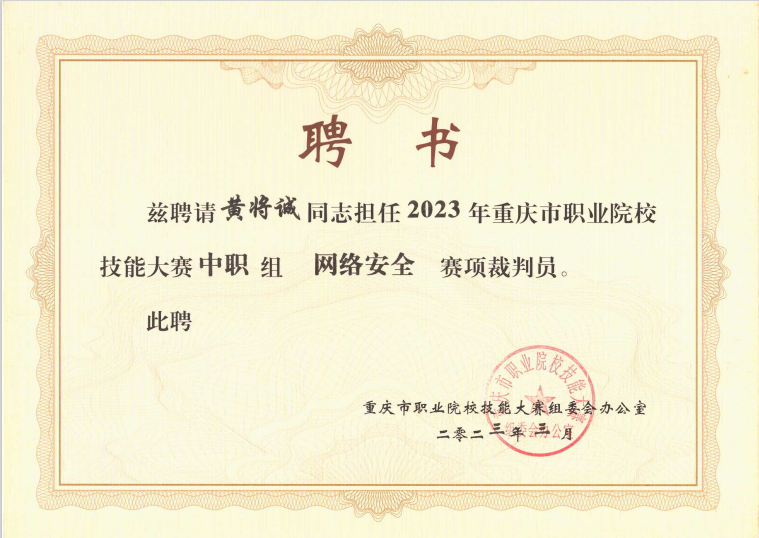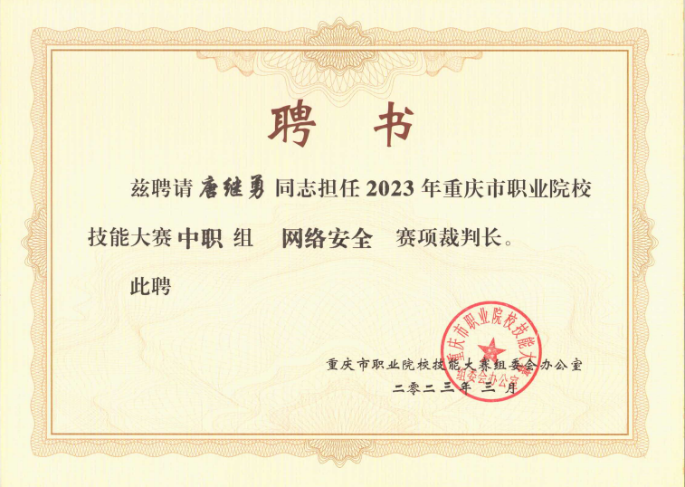 3月17日-19日,“中国银行杯”2023年重庆市职业院校技能大赛(中职组)“网络安全”赛项在重庆开州区职业教育中心举办,我校人工智能与大数据学院唐继勇教授受邀担任赛项裁判长,叶坤、黄将诚受邀担任裁判。
