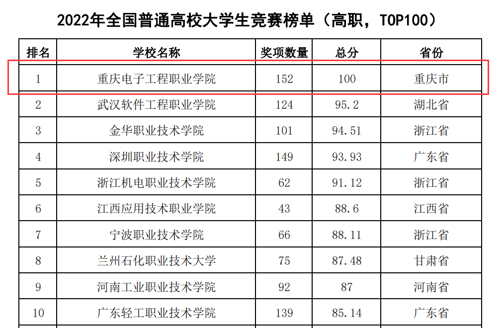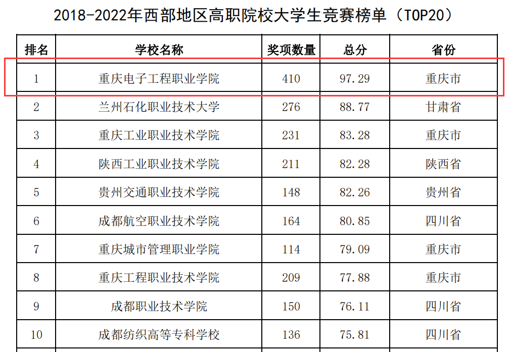 2023年3月22日,中国高等教育学会高校竞赛评估与管理体系研究专家工作组发布《2022全国普通高校大学生竞赛分析报告》https://www.cahe.edu.cn/site/content/16010.html,我校位列《2022年全国普通高校大学生竞赛榜单(高职,TOP100)》全国第一,《2018-2022年西部地区高职院校大学生竞赛榜单(TOP20)》第一。