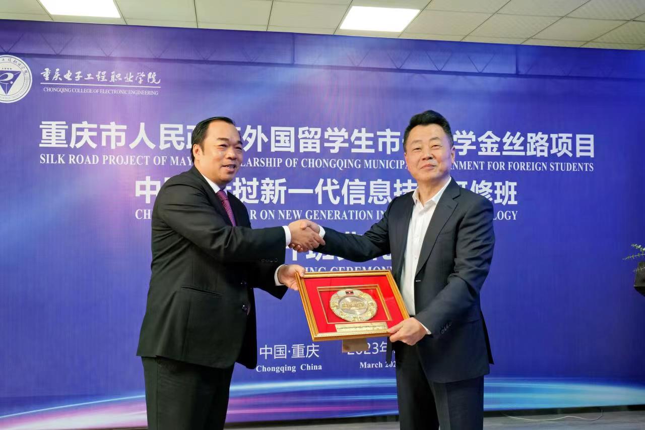 仪式最后,老挝技术通信部智能应用研究院菲萨迈院长代表全体学员,与重庆电子工程职业学院孙卫平书记互赠纪念品,并合影留念。