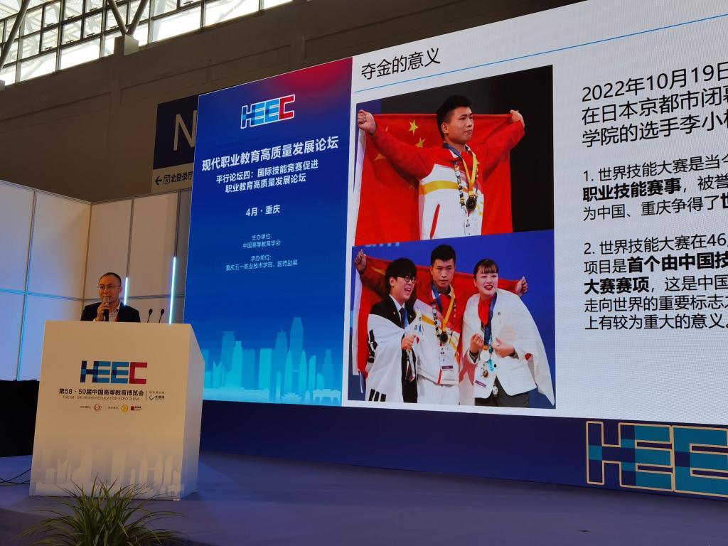 电子与物联网学院教授周渝曦在现代职业教育高质量发展论坛平行论坛四·国际技能竞赛促进职业教育高职发展论坛上作主旨发言,介绍了我校“成功申报首个中国发起的世赛项目”到“代表中国世赛赛场夺金”的发展历程及典型做法。