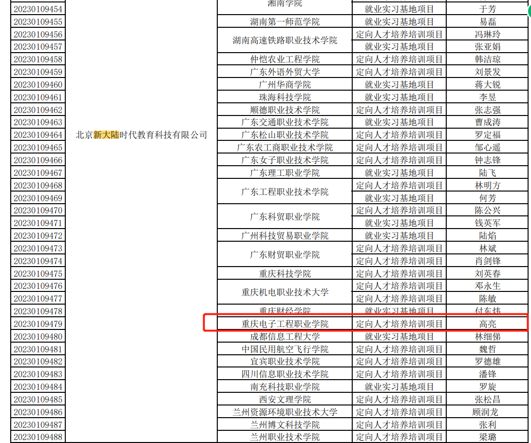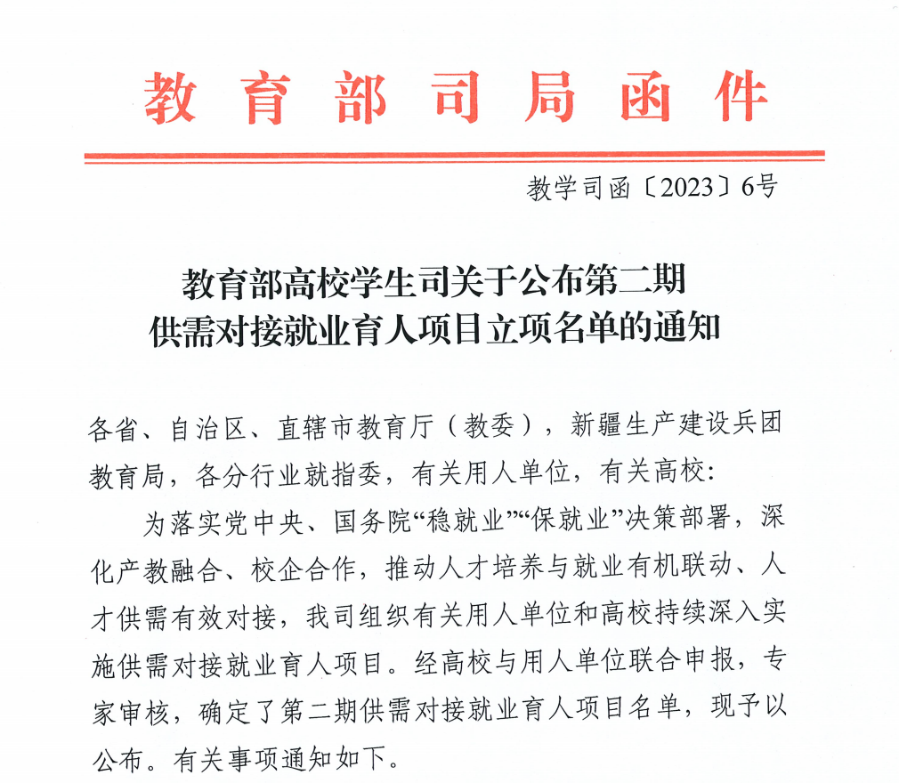 近日,《教育部高校学生司关于公布第二期供需对接就业育人项目立项名单的通知》(教学司函〔2023〕6号)公布,其中电子与物联网学院与北京新大陆时代教育科技有限公司的供需对接就业育人项目”成功立项。