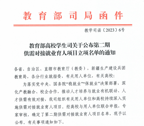 近日,《教育部高校学生司关于公布第二期供需对接就业育人项目立项名单的通知》(教学司函〔2023〕6号)公布,其中人工智能与大数据学院张铁力、刘凤梅主持的两项课题成功立项教育部高校学生司第二期供需对接就业育人项目。