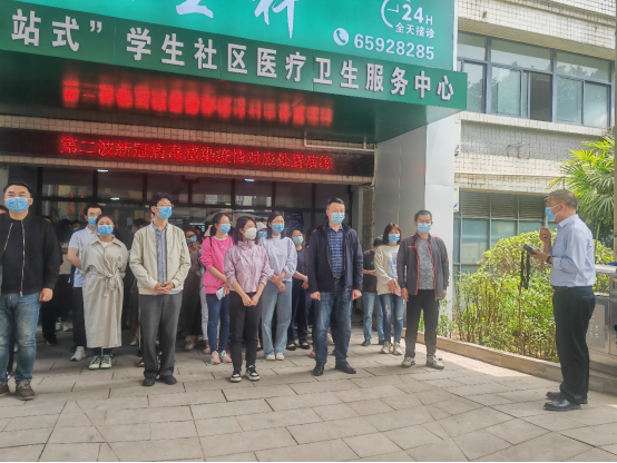培训会后,在陈家桥医院专业人员指导下,开展了学校疫情防控应急预案现场演练。演练由刘洪光副校长主持,疫情防控专项工作组负责人、各二级单位负责人、校医、辅导员、学生代表、物业管理人员等参加了演练。演练主要围绕疫情发现与报告、应急机制激活、校园疫情处置、现场流调、采样检验、医疗救治、疫点消毒等环节有序开展疫情处置。