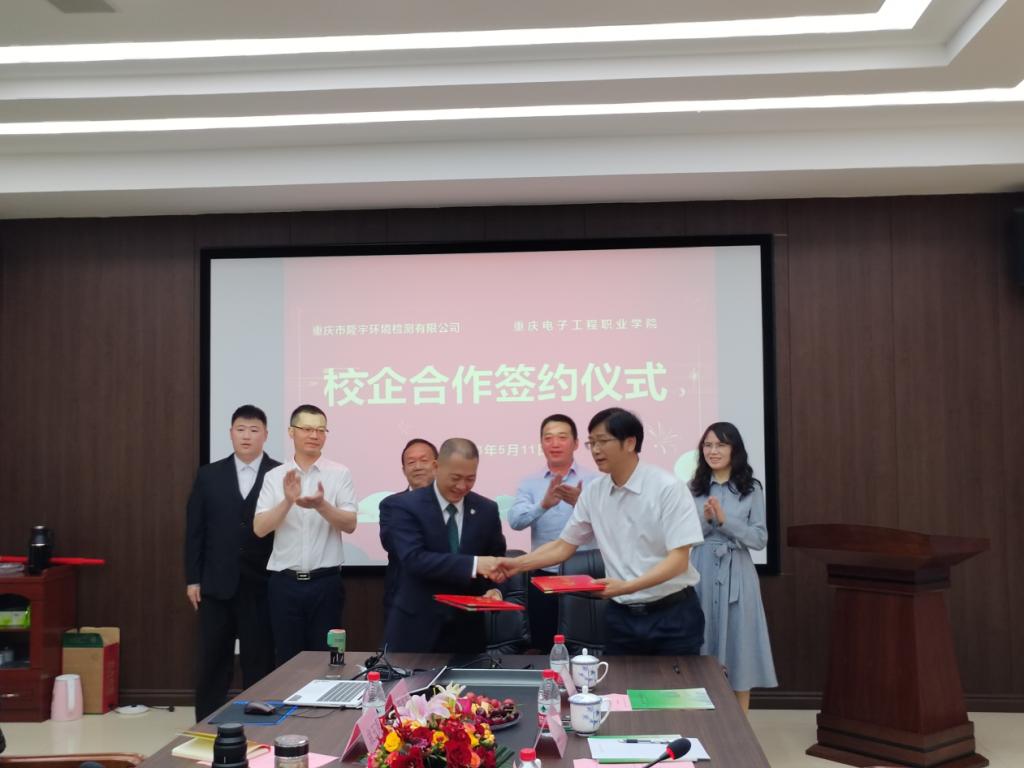 2023年5月11日。重庆电子工程职业学院副校长黄爱明、建筑与材料学院院长周国清、党总支副书记袁玉刚(主持工作)、教务处副处长张慧敏、材料工程技术专业教研室主任刘恩美等老师及学生一行赴重庆市永川区凤凰谷产业园洽谈校企合作,深化产教融合,并与重庆市隆宇检测有限公司及重庆邦锐特新材料有限公司签署校企人才战略合作协议。