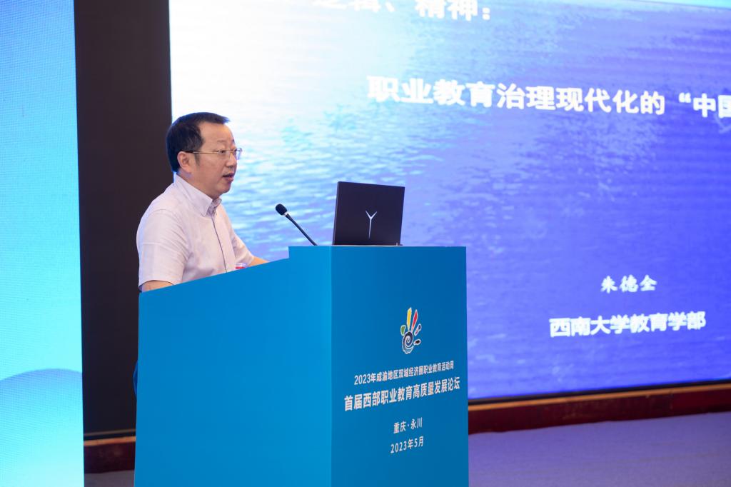 西南大学党委委员、教育学部部长朱德全的作了题为《职业教育治理现代化的“中国道路”》的主旨报告。他以当前职业教育的缺理性、缺逻辑、缺精神等“三缺”问题入手,从招生战略、人才战略、学科战略、体系战略、融合战略、园区战略等“六大战略”提出了职业教育高质量治理的“中国道路”,为职业教育治理现代化提出了宝贵的建议。