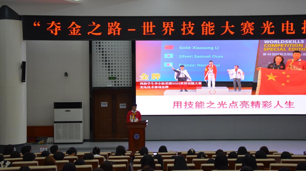 周渝曦组长介绍了世界技能大赛、大赛所包含的项目、光电技术赛项等,展示了我校学生李小松的夺金之路,解读了光电技术项目首次夺金的意义,分享了各种媒体关于李小松夺金的报道。