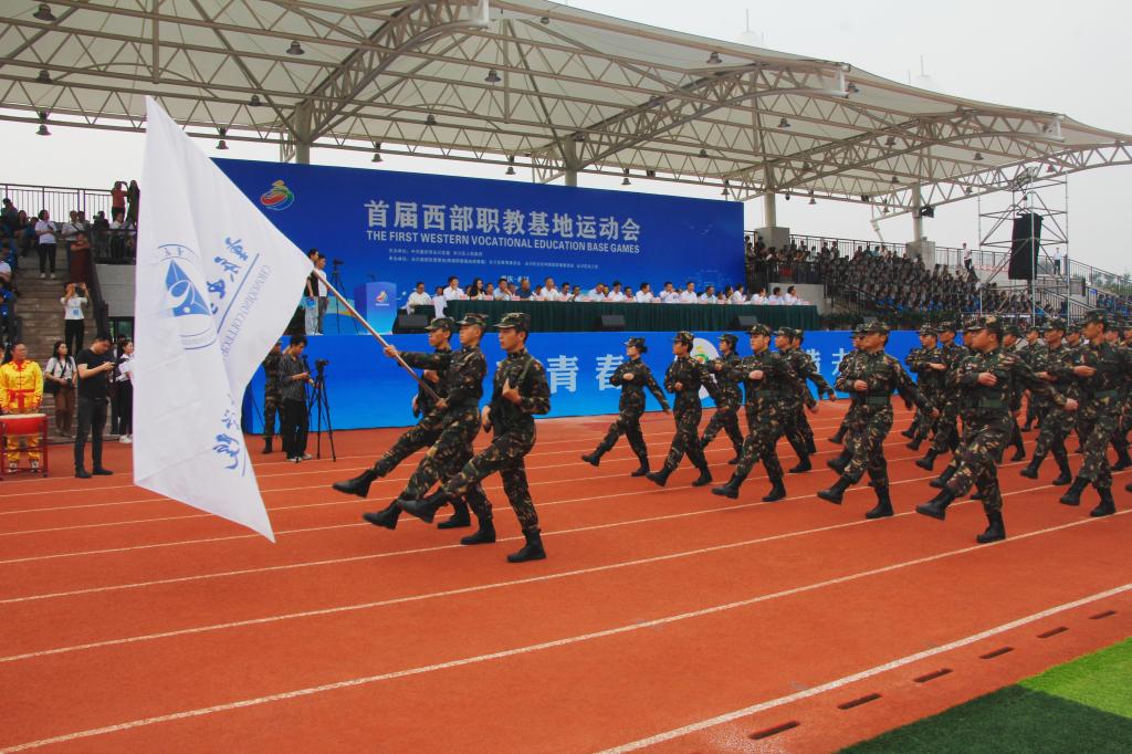 副校长冉学农率代表队方阵和学生足球参赛队参加首届西部职教基地运动会开幕式