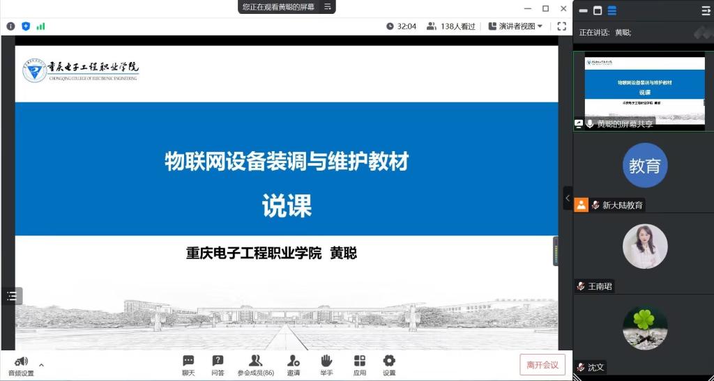 新大陆教育创新研究院的资深专家沈文也对产教融合背景下新大陆特色教材开发的探索与实践进行了分享。然后由我校一线教师分别对《物联网工程设计与管理》《物联网设备装调与维护》以及《物联网系统部署与运维》三本教材进行了详细的课程说明。