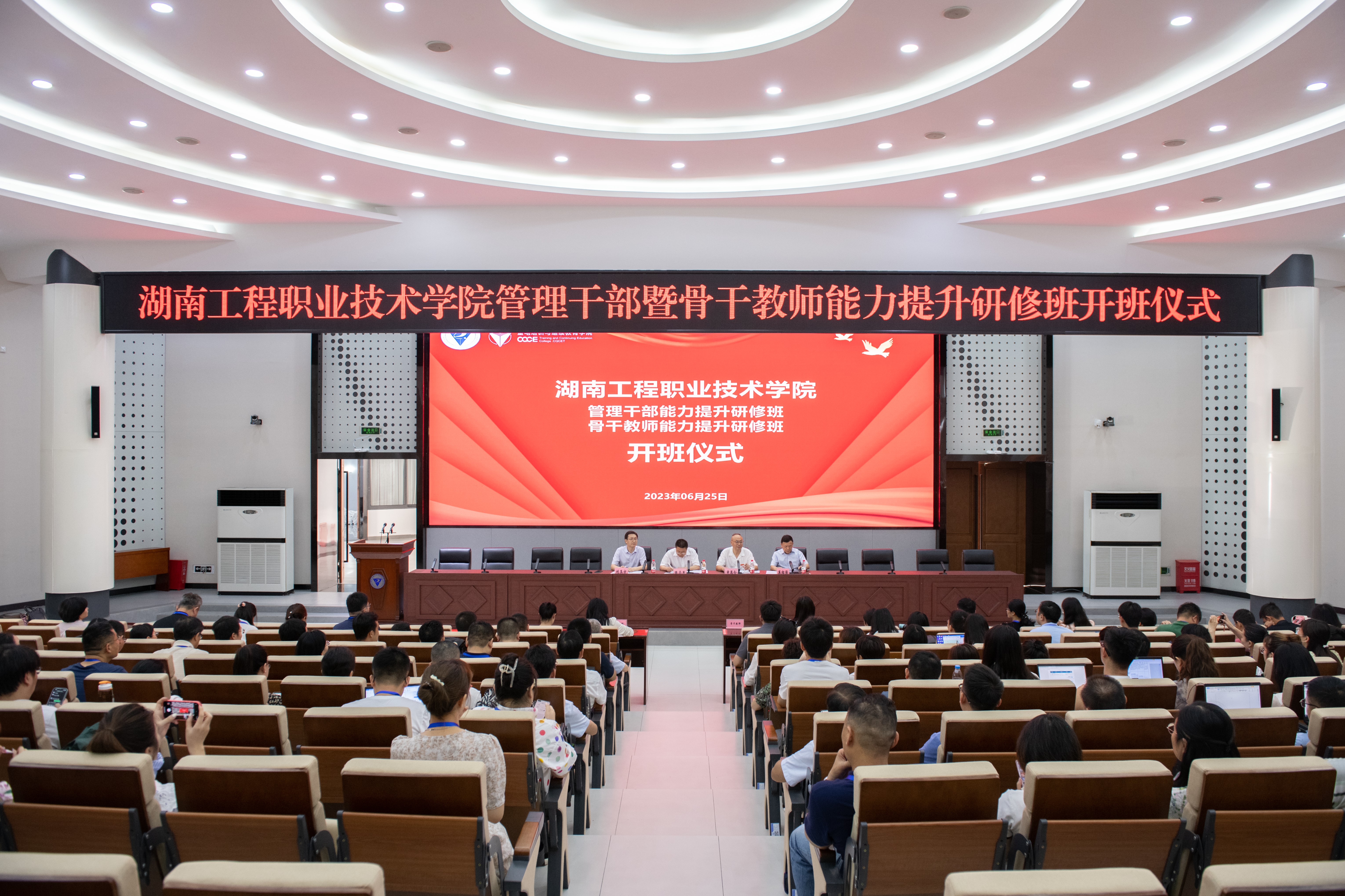 2023年6月25日上午,湖南工程职业技术学院管理干部暨骨干教师能力提升专题研修班开班仪式在我校博远厅举行。湖南工程职业技术学院党委副书记、校长陈志军,党委委员、副校长刘玉方,我校副校长幸昆仑,培训与继续教育学院院长、国培基地办主任莫绍强,以及来自湖南工程职业技术学院的126名管理干部和骨干教师参加开班仪式。开班仪式由莫绍强院长主持。
