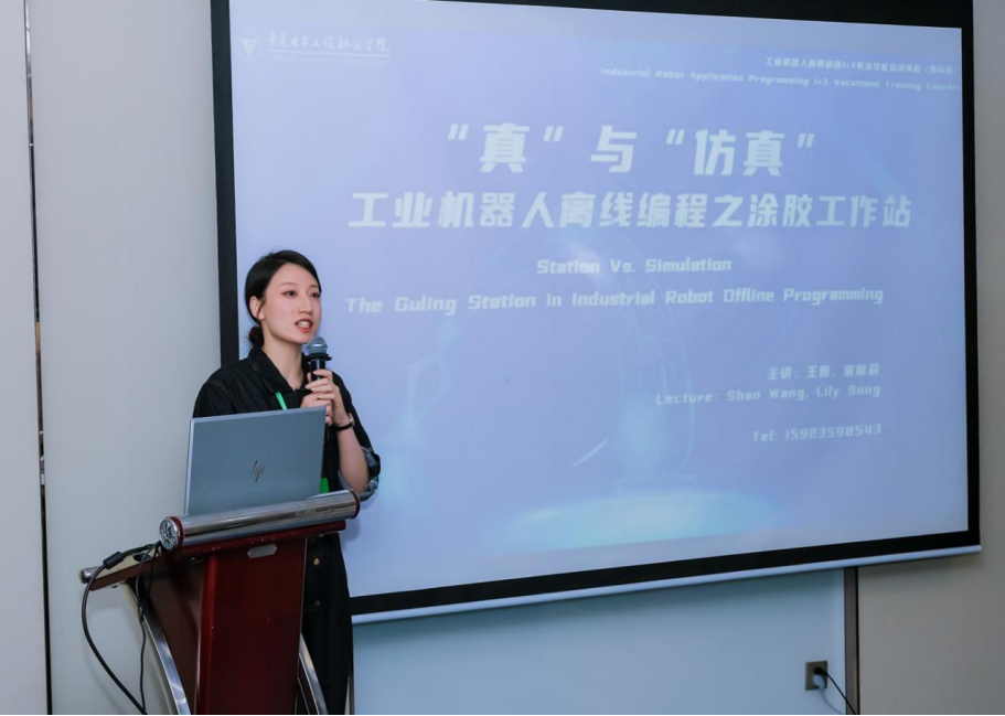 基于智能制造与汽车学院国际办学的丰硕成果,本次共有2位老师受邀参会并做主题分享,汽车系副主任宋丽莉以“融通‘四环四驱’,赋能智能制造”为题,在“说专业群”分会场做“汽车制造与试验技术双高专业群”研讨汇报。自动化系教师王姗依托“工业机器人集成应用”国际化双语课程,在“示范课”分会场做研讨汇报。