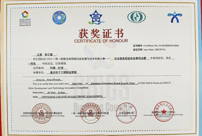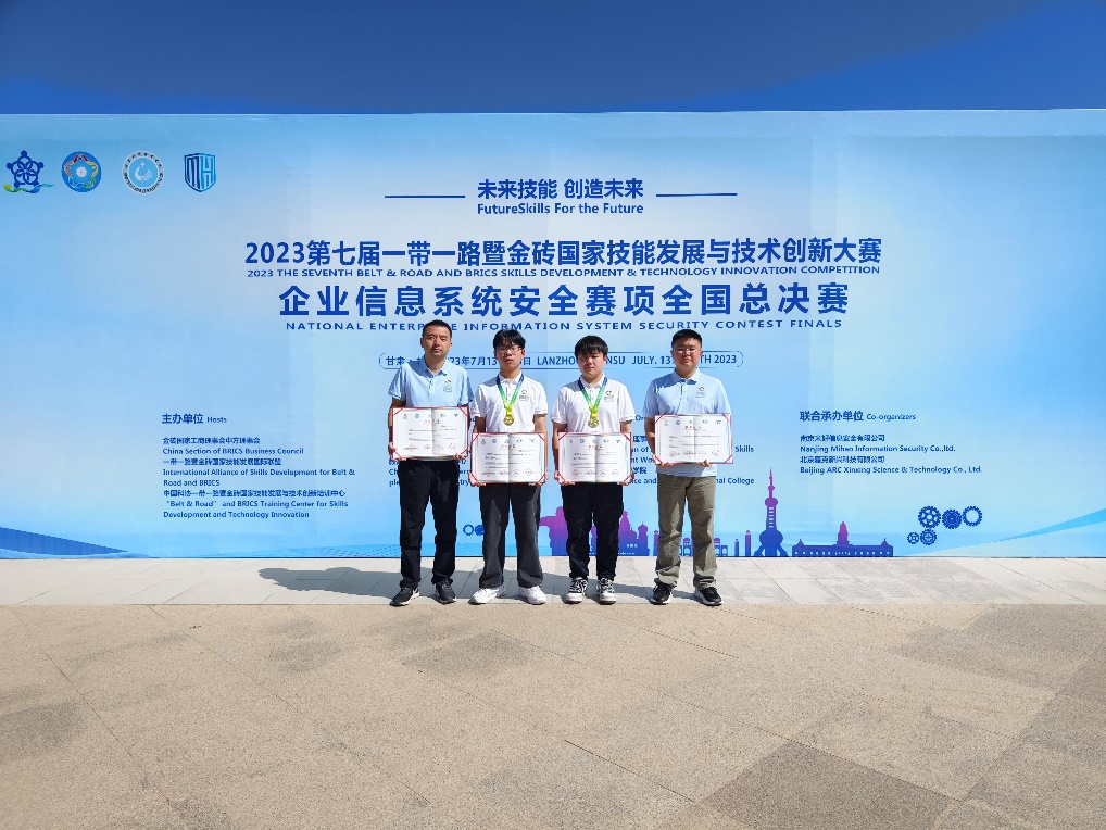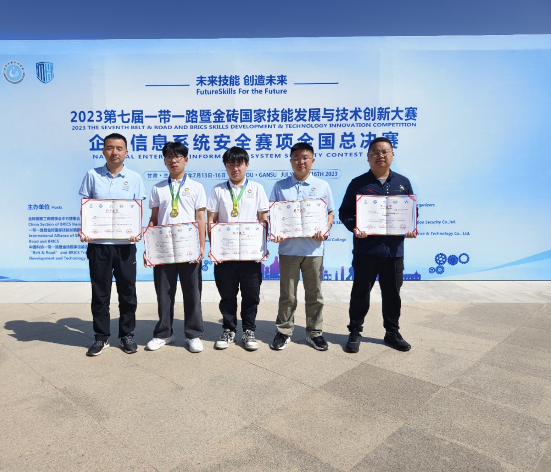 2023年7月13日-2023年7月16日,人工智能与大数据学院教师何倩和叶坤带领学生选手彭正富、江傲在甘肃兰州参加了2023一带一路暨金砖国家技能发展与技术创新大赛的“企业信息系统安全”赛项国赛总决赛,并经过奋力拼搏最终获得了一等奖。