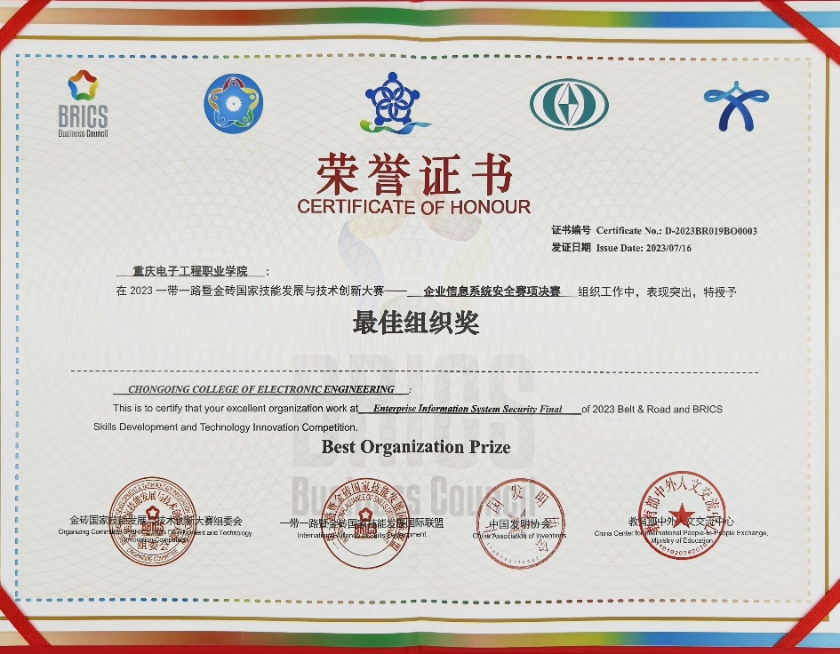这次取得的一等奖,标志着重庆电子工程职业学院在信息安全领域的教学和培养工作取得了显著成果。学院将继续致力于培养更多优秀的技术人才,为推动我国信息安全事业的发展贡献力量。这次荣誉的取得也是对学校卓越技术技能星空(中国)计划的肯定,同时也彰显了学校在培养高素质人才方面的独特优势。学院将继续秉持创新、卓越的教育理念,为培养更多具备工匠精神和创新能力的技术人才做出更大贡献。