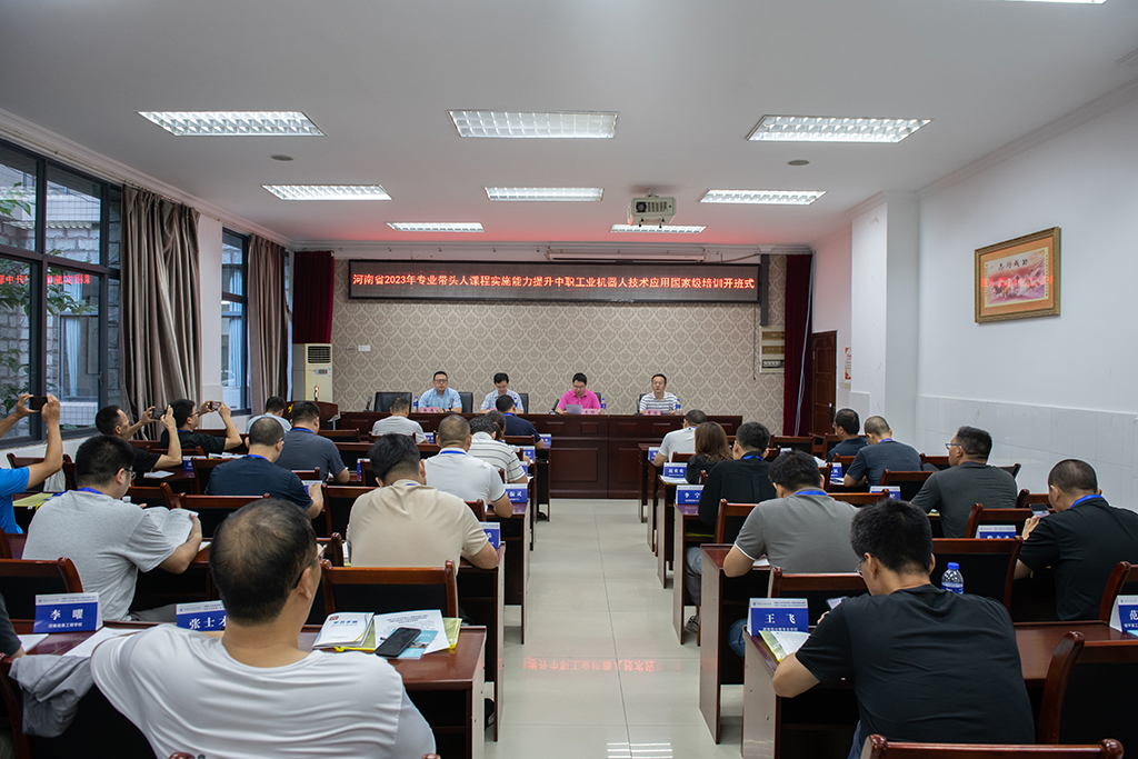 2023年7月31日上午,河南省2023年专业带头人课程实施能力提升中职工业机器人技术应用国家级培训班在我校国培基地1-101室举行,我校智能制造与汽车学院党总支副书记丁伟,自动化系第一党支部书记、系副主任张伟,培训与继续教育学院培训科负责人王科以及来自河南省各中职学校的30名教师参加开班式。