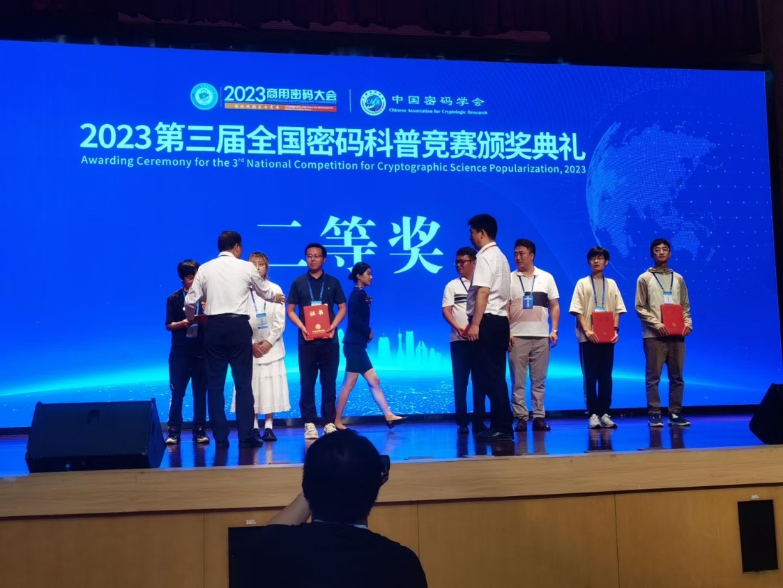 2023年8月10日,2023第三届全国密码科普竞赛决赛及颁奖典礼在郑州举行,来自全国各大高校、企业和科研院所共285项作品参赛,经过网评共有90项作品入围总决赛。我校人工智能与大数据学院密码技术应用专业肖鑫、杨璐、赵玉洁三名同学的作品《隐私加密技术——秘密共享》,在指导教师罗攀及团队的指导下,荣获总决赛二等奖,这是高职院校首次参加该项比赛,我校参赛作品也是唯一获得二等奖以上的高职院校作品。