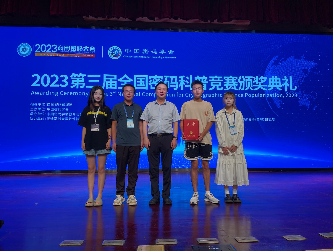 全国密码科普竞赛是在国家密码管理局指导下,由中国密码学会主办,旨在深入贯彻落实《中华人民共和国密码法》,加强密码科普宣传教育,促进全社会“知密码、懂密码、用密码”,进一步推动密码在全社会的普及教育。自2021年至今,该比赛已连续举办3届,本届比赛一共收到来自各大高校、企业和科研院所等67个单位、285项作品参赛。总决赛分为大众评审及现场终评,经过激烈角逐,共评出一等奖2项,二等奖21项,三等奖61项,人工智能与大数据学院院长武春岭教授和项目指导教师罗攀率队参加了总决赛。