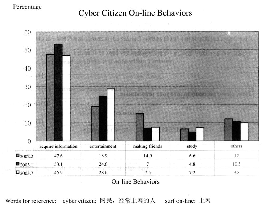 From the chart we can see that about 50 percent of the cyber citizens often surf on-line for the main purpose of acquiring information. The percentage of this leading purpose has always kept the largest proportion, though it decreased a little in July 2003 compared with that of half a year before. Entertainment is the second main purpose of surfing on-line. The percentage of entertainment has been increasing rapidly within this year. There is an obvious decrease in the number of cyber citizens who make friends through the Internet. However, more and more people surf on-line for the purpose of study.