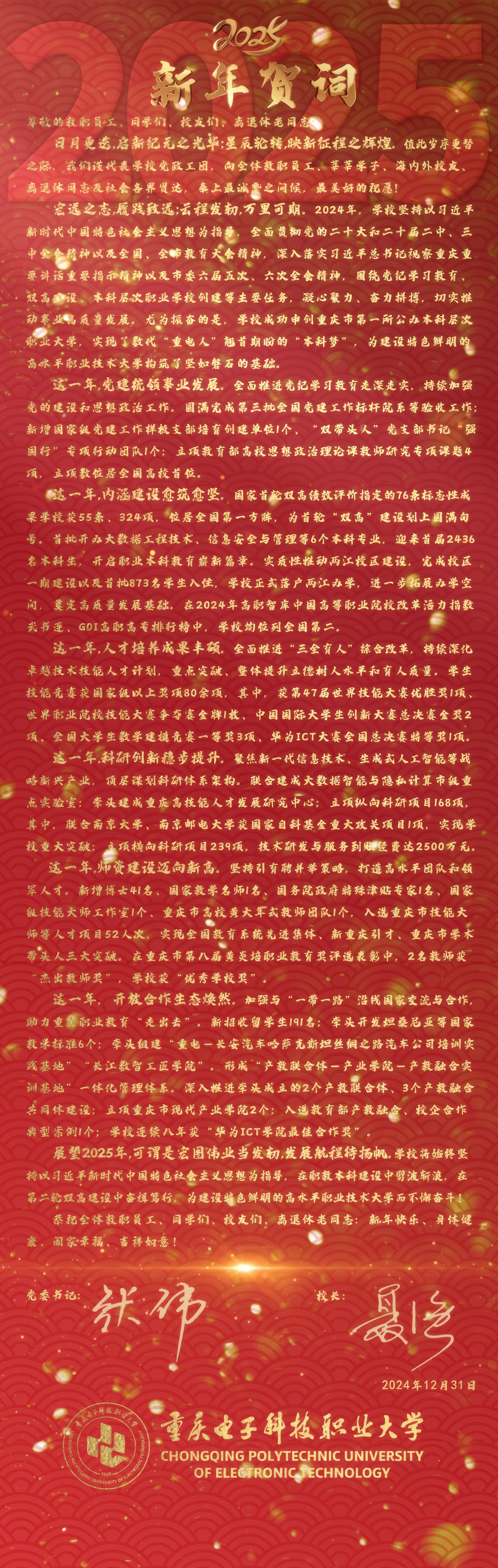 快速链接: 书记信箱 校长信箱 国家智慧教育公共服务平台 信息公开 合作发展 人事招聘 网络安全 招标公告 重电印象 在线学习 课程思政 双高建设专题网 正版化软件 重庆电子信息行指委 重庆职教思政课程教指委