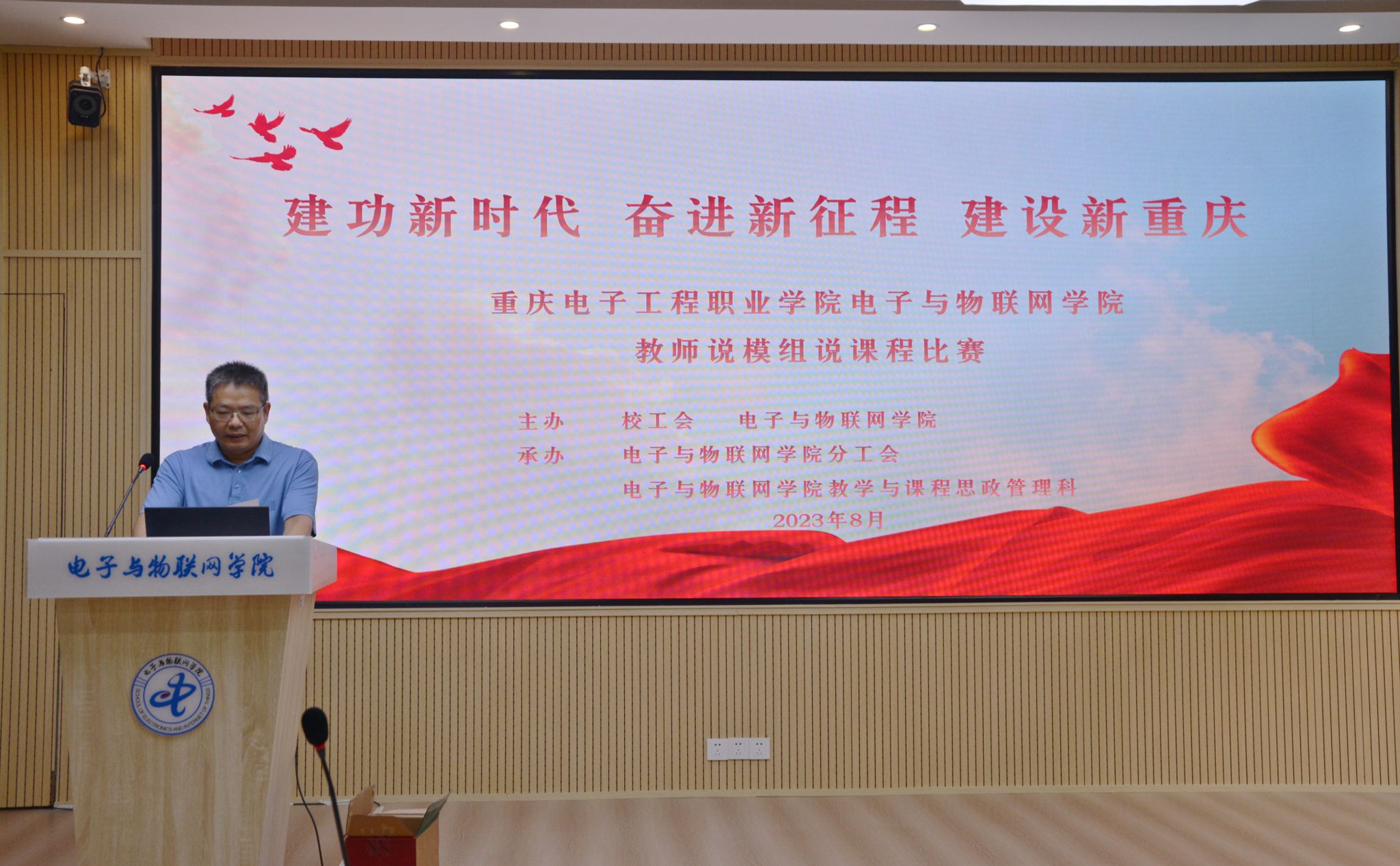 8月29日至30日,重庆电子工程职业学院电子与物联网学院学院教师说模组说课程比赛在12106多功能教室举行。此次说课比赛主题为“建功新时代 奋进新征程 建设新重庆”,由我校工会、电子与物联网学院联合主办,学院分工会和教学与课程思政管理科承办。学校副校长冉学农、校工会常务副主席唐莉出席,特邀钟国祥、许磊、罗巧玲、骆永菊、牟向宇为专家组进行现场评审,我院领导及教师全程参与。