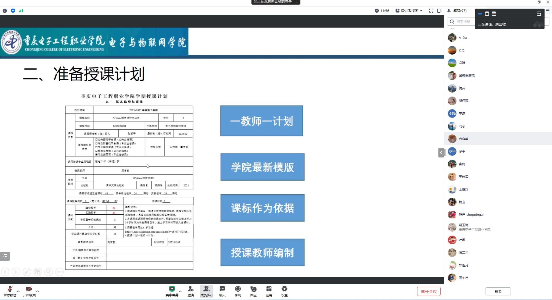 周言敏为企业兼职教师讲解课前教学资料