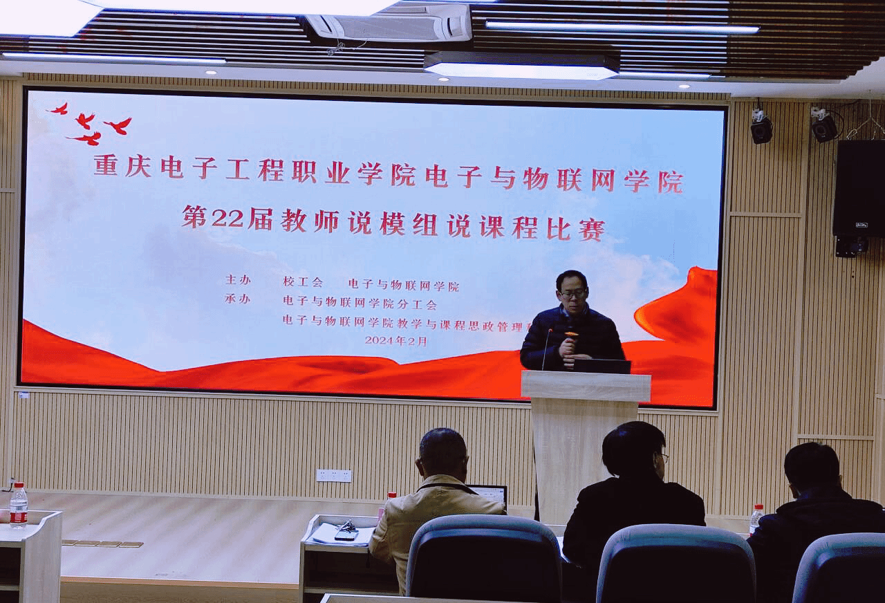 近日,电子与物联网学院12-106多功能教室顺利举办“第22届教师说模组说课程”比赛。比赛旨在提升教师的教学水平,推动教育教学改革,活动得到校工会和学院领导的高度重视。邀请重庆大学曾孝平教授、我校质量管理中心处长钟国祥教授、建筑与材料学院梅晓莉教授担任本次比赛评委专家,校工会办公室主任刘涛担任嘉宾,学院处科级领导及全体专兼任教师参赛。