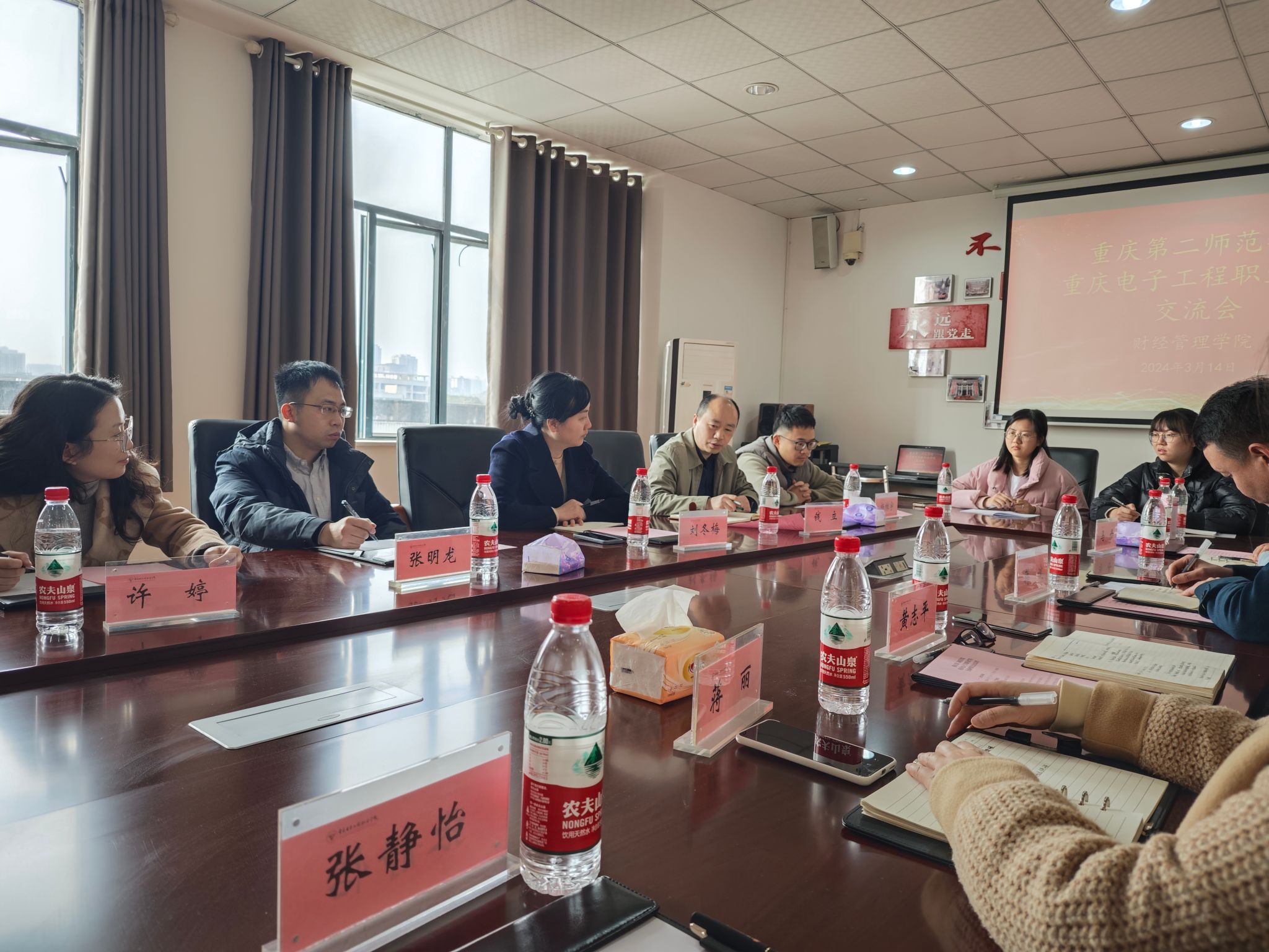 2024年3月14日上午,重庆第二师范学院经济与工商管理学院党总支书记刘冬梅,副院长钱立、电子商务专业负责人张明龙、就业联络人杨维宇、教学秘书许婷一行5人到我院就电子商务专业联合培养班事宜进行了交流。学院党总支书记蒋斌、院长黄志平、教学与课程思政科科长蒋丽、质量科马丹及教师和学生代表出席了会议。