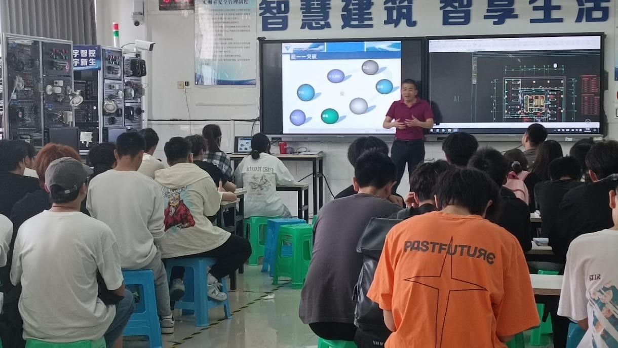 讲座在学院6204楼宇自控实训室举行,由建筑智能化工程技术专业带头人杨张利教授主讲。杨教授以“建筑行业大背景下如何提升自身软实力”为主题,从建筑行业的国民经济地位、当前面临的挑战、以及数字化经济下的发展趋势等多个维度,全面分析了行业现状。他强调,在行业-企业-专业-岗位之间的链式关系中,职业素养的养成至关重要,尤其是沟通、合作、创新、自立等软实力的培养。