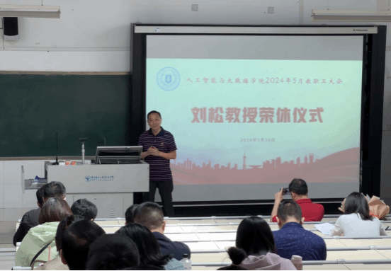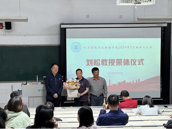 2024年5月30日下午,人工智能与大数据学院在7-210召开教职工会议,会上,学院为6月初即将退休的刘松教授举行荣休仪式。仪式由学院党总支书记吴焱岷主持,全体院领导、教职工共同见证这一光辉时刻。