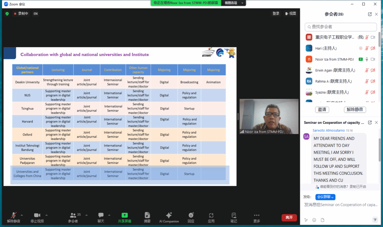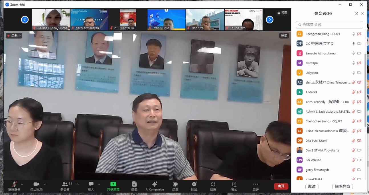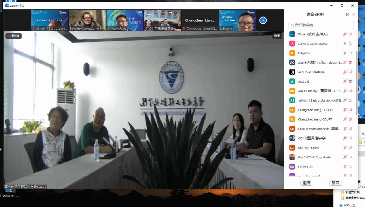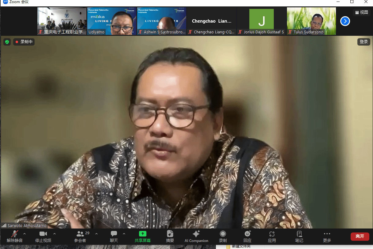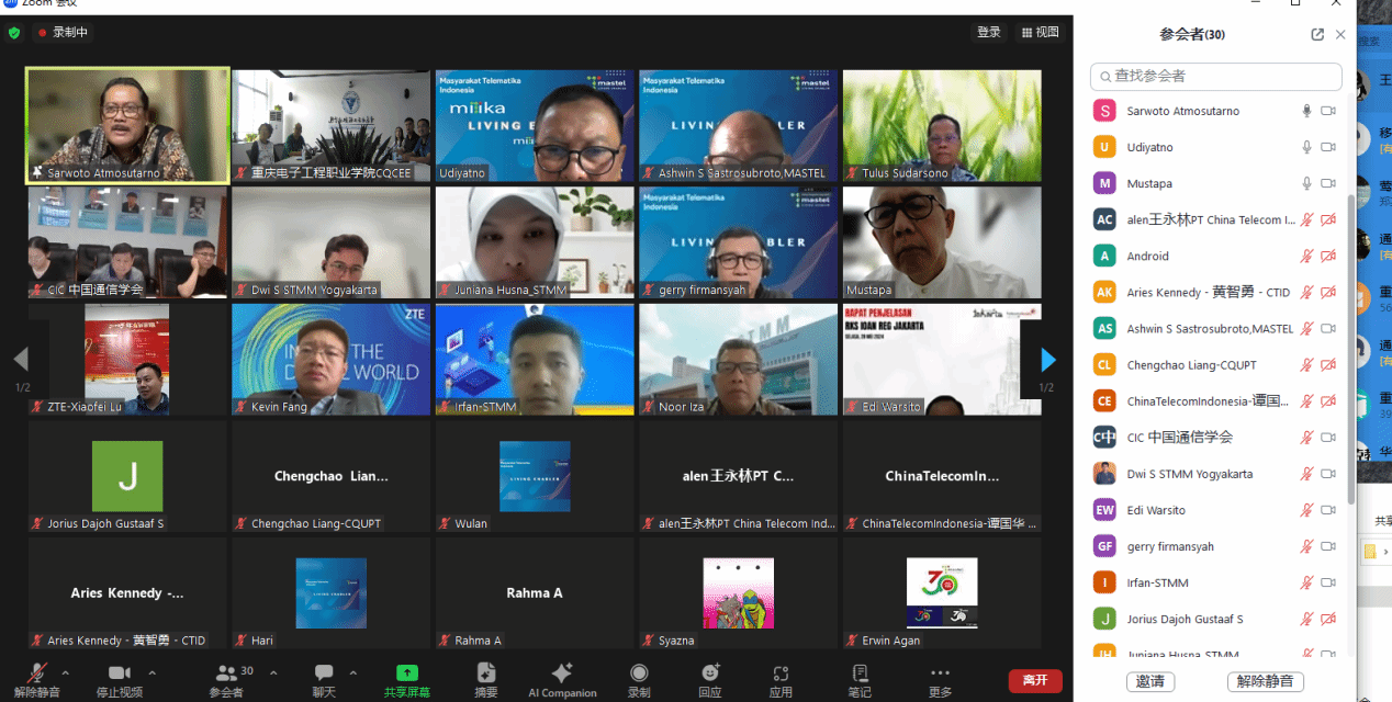 2024年6月5日下午,中国通信学会与印尼通信协会(MASTEL)通过“数智工场”平台,就云计算与信息通信领域的工程师能力建设和国际合作举行了线上研讨会。参与方包括重庆电子工程职业学院、印尼多媒体学院、重庆邮电大学、江苏电子信息职业学院以及中国电信、中兴通讯、艾优威科技等企业与学校。中国通信学会副秘书长欧阳武,印尼通信协会主席Sarwoto Atmosutarno、执行理事Tulus Sudarsono、数字文化发展与国家人才处主管Ashwin Sasongko Sastrosubroto,印尼多媒体学院主席Noor Iza、学术事务副院长Shinto Dwirawati,重庆邮电大学梁承超教授、江苏电子信息职业学院计算机与通信学院院长徐义晗,中国电信印尼公司总经理王永林、副总经理谭国华,中兴通讯印尼子公司教育行业总监芦晓飞、首席营销官方志伟,深圳市艾优威科技有限公司方案总监陈峰等应邀参会。我校副校长幸昆仑、国际交流与合作发展处处长刘宏宇、通信工程学院院长陶亚雄等负责人参加会议。