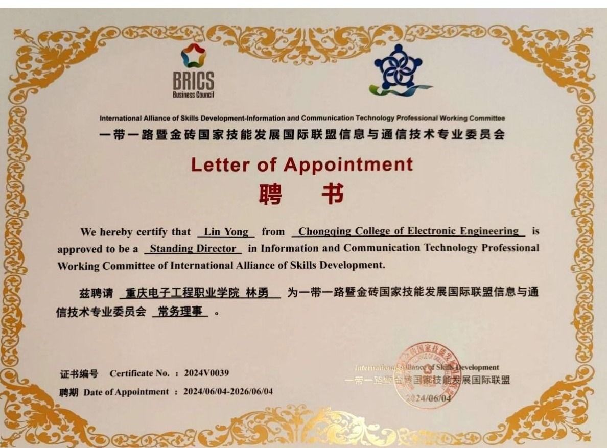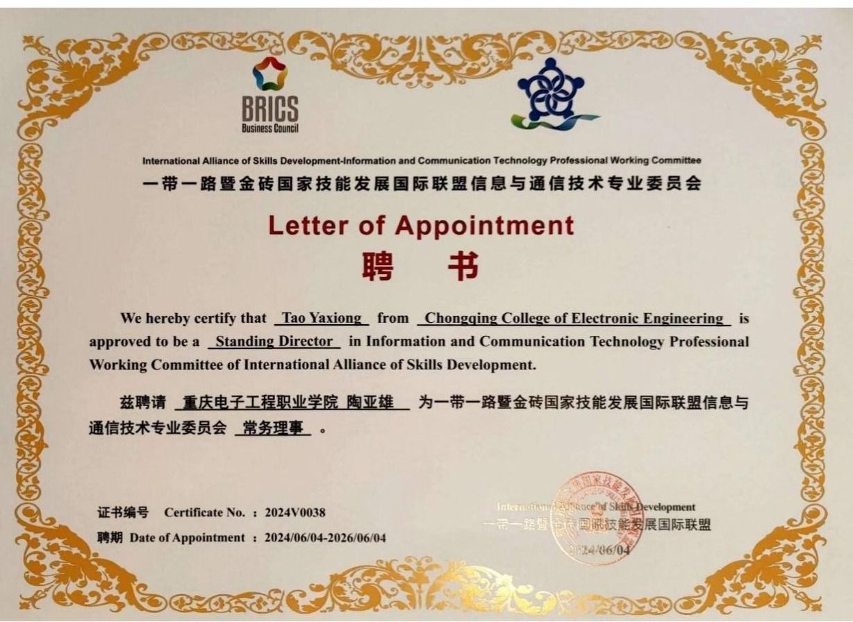 在论坛上同时签署了中-巴西技能发展与技术创新合作备忘录和成立了一带一路暨金砖国家技能发展国际联盟信息与通信技术专业委员会,我校通信工程学院陶亚雄院长、林勇教授被聘为常务理事。