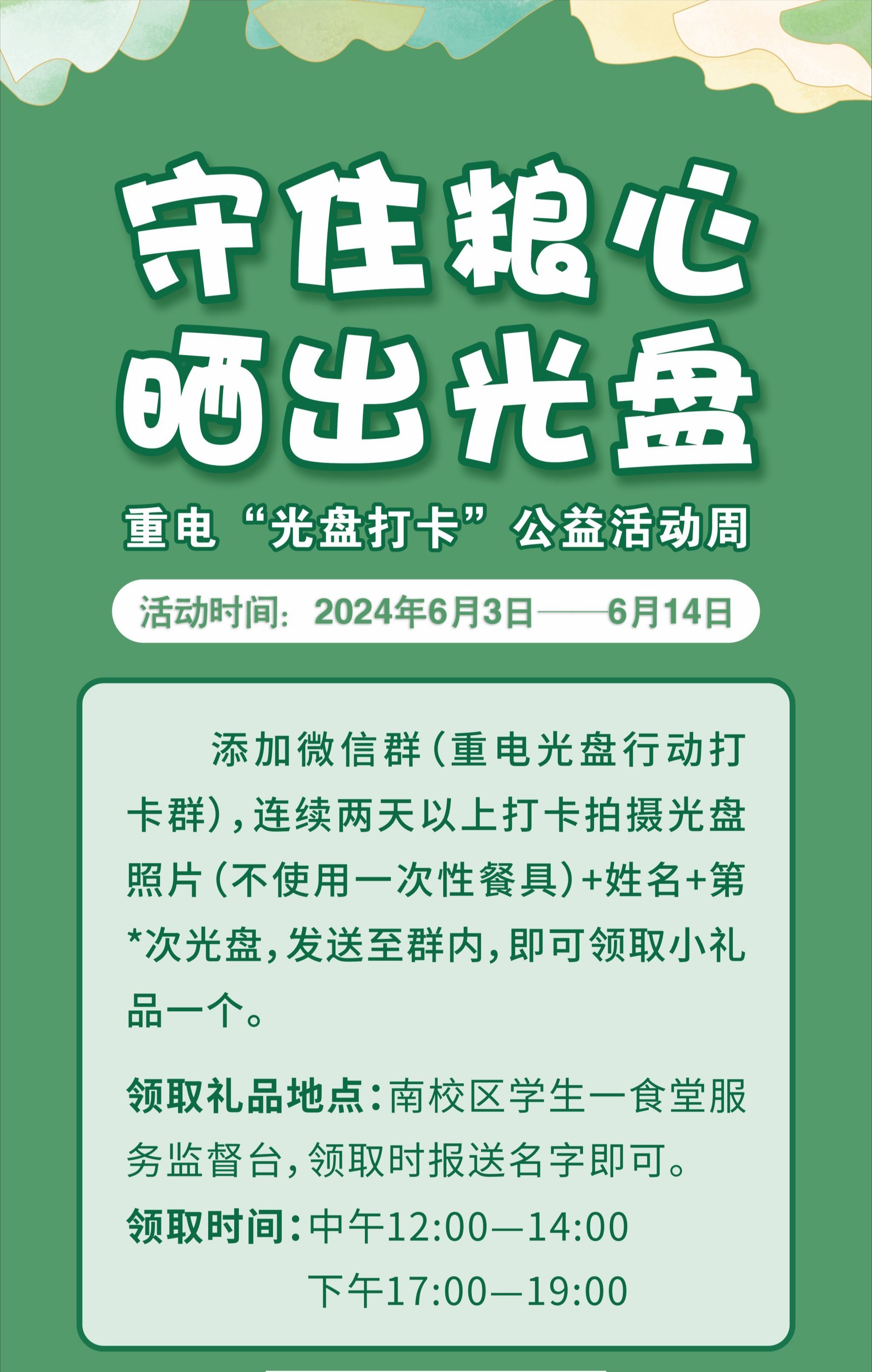 为增加全校师生参加活动的热情,南校区一食堂特别为参加活动的师生们准备了小礼品,鼓励他们养成文明就餐,不使用一次性餐具,珍惜盘中餐的好习惯,积极晒出“光盘”。