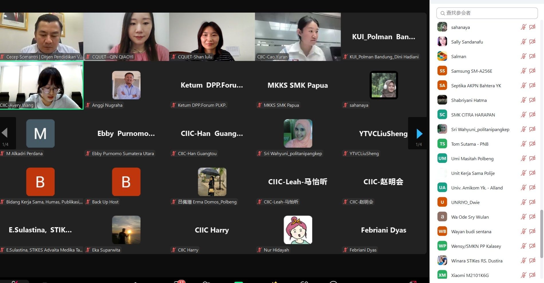 6月20日下午2:00,我校受邀参加印度尼西亚教育部、中智国际教育科技(北京)有限公司留学生项目线上会议。参会人员有印尼教育部Ceccep Somantri 博士,印度尼西亚各州立职业学院、各教育办公室、各高等教育中心机构代表,烟台职业学院国际交流与合作部留学生项目负责人刘胜及其技术团队,中智国际教育科技(北京)有限公司总经理助理兼事业部总经理许海军、重庆办公室负责人余长江、高级经理韩光透、项目经理李昊阳、项目助理曹雨然、王晨、马怡昕,以及我校国际交流与合作发展处科长覃乔亦、科员单璐璐。