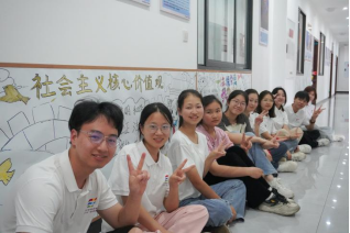 (志愿者与青少年在手绘文化墙前合影)