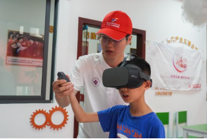 随后,志愿者周俊林与所有志愿者一起向“数字小侠”们展示了如何使用VR设备。从佩戴VR一体机的那一刻起,孩子们便被带入了一个个精彩纷呈的虚拟世界,亲身体验到科技编织的梦幻与无限潜能。这一过程不仅教会了“数字小侠”们操作技巧,激发了他们对虚拟世界的好奇心和探索欲,为他们的数字素养成长之路铺设了坚实的基石。