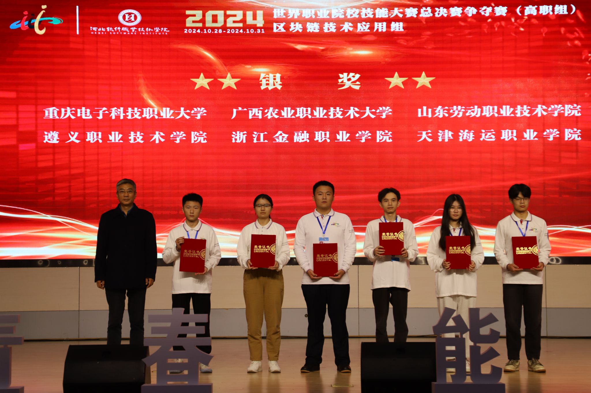 10月31日,2024年世界职业院校技能大赛总决赛争夺赛高职组电子与信息赛道二“区块链技术应用”小组(赛项)在河北软件职业技术学院落下帷幕,我校人工智能与大数据学院杨睿、胡心雷两位老师指导的赵永杰、娄波、刘洪宇、钟洋怡等四位学生组成的参赛队伍,在比赛中发挥稳定,最终夺得团队银奖。