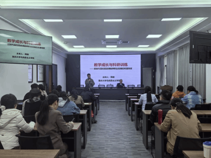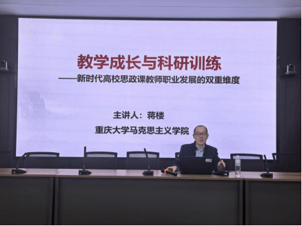 蒋楼博士以“新时代高校思政课教师的教学成长和科研发展”为主题,围绕如何上好思政课,就上好思政课的专业素养、提升教学科研素养等方面分享自己多年的教学科研经验,并从“认清新时代新征程的新形势和新任务”“构建多维一体的课程教材和教学体系”“坚持守正创新不断提高思政课实效性”“争做乐教善教、潜心育人的思政名师”四点要求进行解读。会上,教师们就蒋楼博士的主讲内容进行了探讨与交流,蒋楼博士也就大家的疑惑进行了解答。