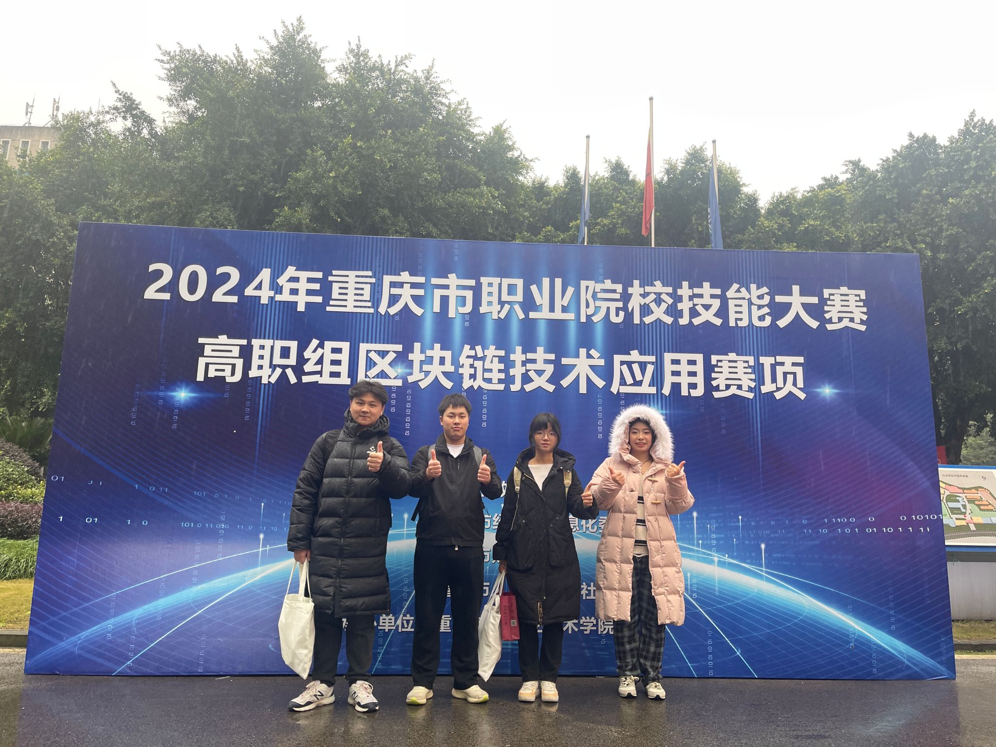 由重庆市教育委员会、重庆市经济和信息化委员会、重庆市财政局、重庆市人力资源和社会保障局联合主办,重庆航天职业技术学院承办的2024年重庆市职业院校技能大赛区块链技术应用赛项,于2025年1月9日在重庆航天职业技术学院落下帷幕,我校胡心雷、张恒、杨睿、王正霞等老师指导的梁缘、袁佳佳、赵永杰、娄波、陶琳佳、雷娇、刘洪宇、钟洋怡等8位同学组成2个参赛队参加了比赛,比赛中选手们沉着应对、稳定发挥,分别夺得金奖、银奖各1项,且获得国赛出线权,将代表重庆市参加2025年世界职业院校技能大赛区块链技术应用赛项比赛。