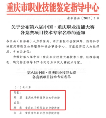 近日,第八届中国·重庆职业技能大赛各竞赛项目技术专家名单公布,我校人工智能与大数据学院路亚、杨睿两位老师分别入选云计算项目专家组长、成员。