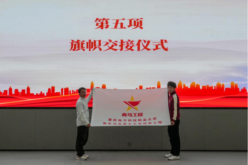 第十八期“青马工程”培训班学员代表杨雨杭与星空在线登录官网第一期“青马工程”培训班学员代表李准进行“青马”旗帜交接。