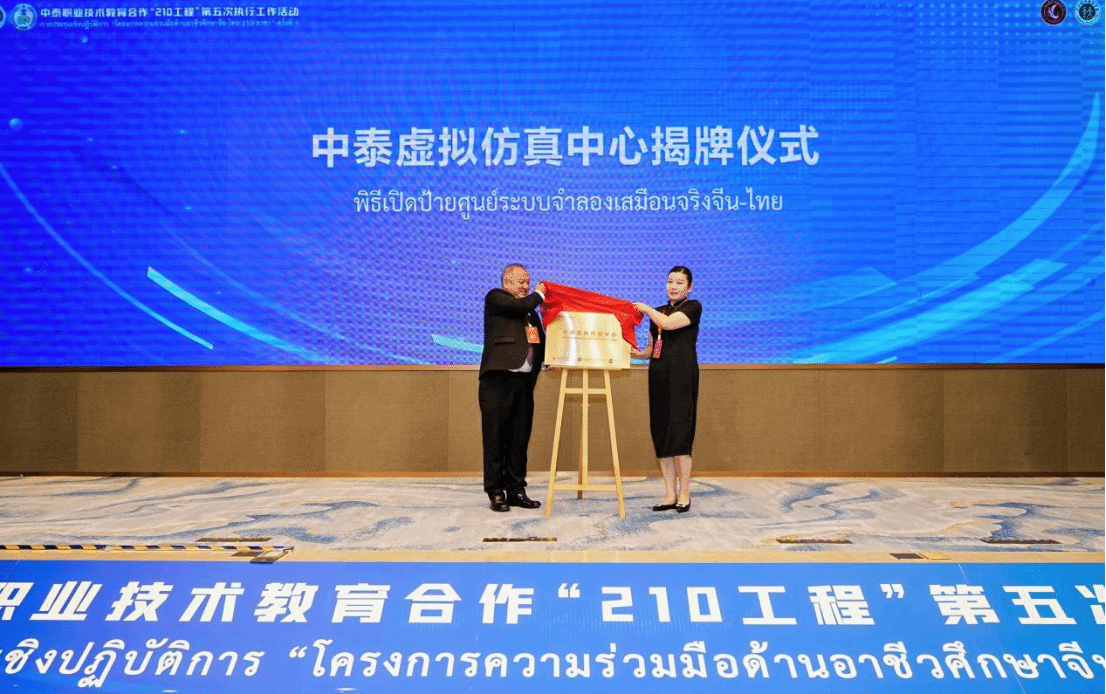 会上,泰国教育部职业教育委员会秘书长尤萨蓬·韦努科塞与我校数字技术与设计学院谢永院长共同为中心揭牌。