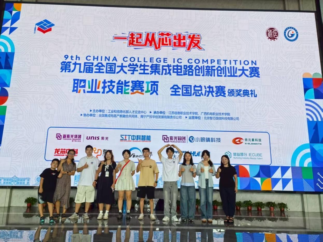 2025 年8月8日-10日,第九届全国大学生集成电路创新创业大赛职业技能赛项全国总决赛分别在无锡和南宁两个赛区举办。我校电子与物联网学院(集成电路学院)学生喜获一等奖2项、二等奖5项、三等奖2项的好成绩。