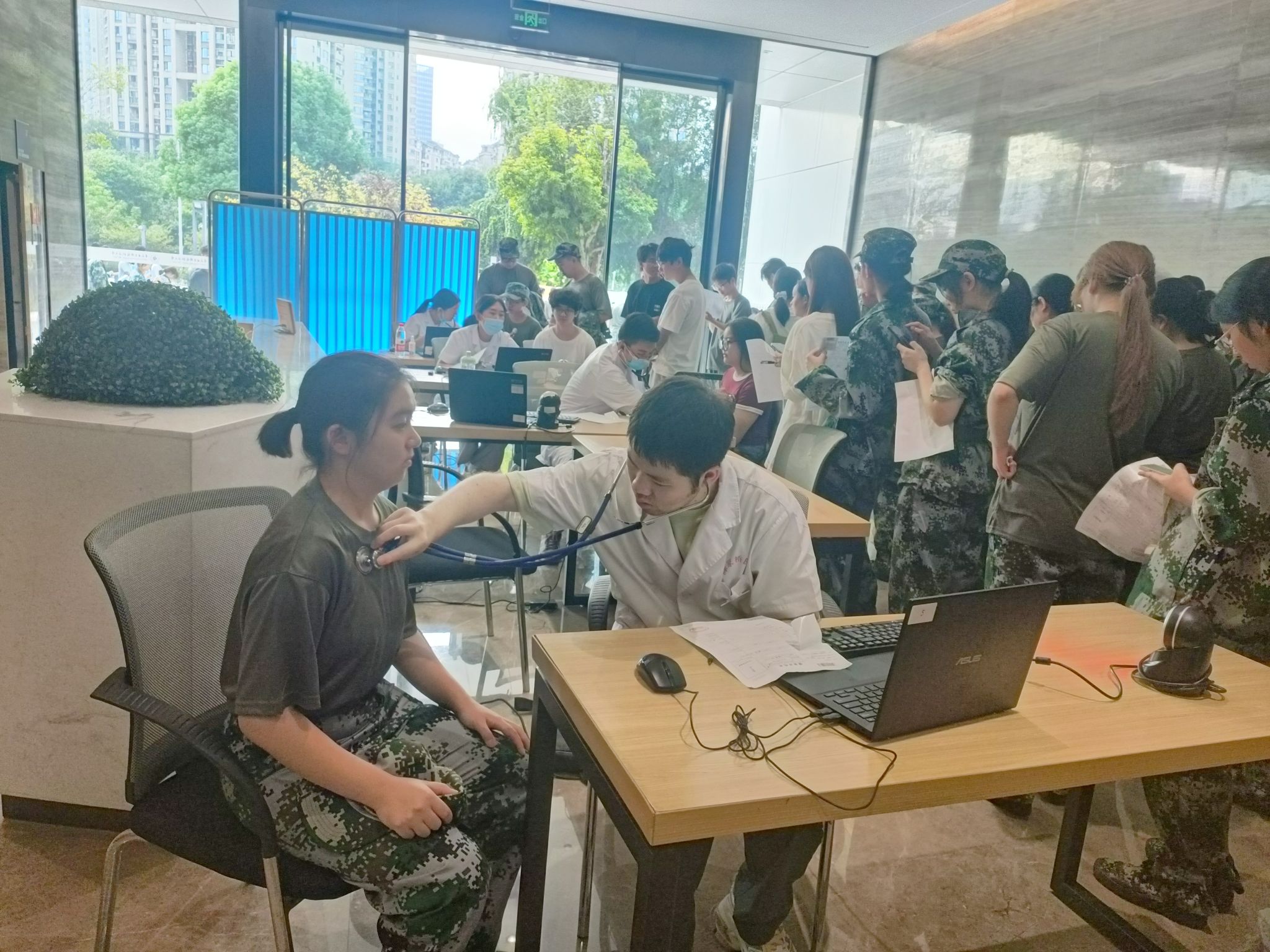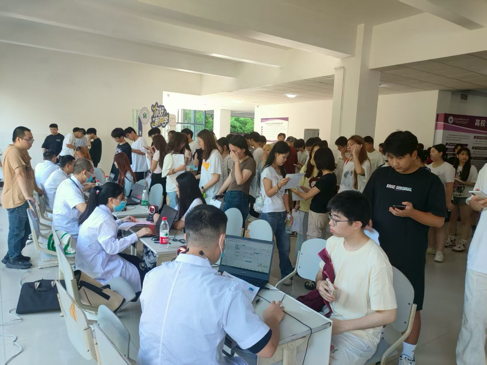 基建后勤处提前联动陈家桥医院制定方案,做好物资筹备、信息录入、场地布置等工作。体检含血常规、外科、内科、胸片、心电图等项目;现场设专人引导分流,为不适新生提供免排队服务、为低血糖学生提供免费糖水、新生分时分批有序参检。